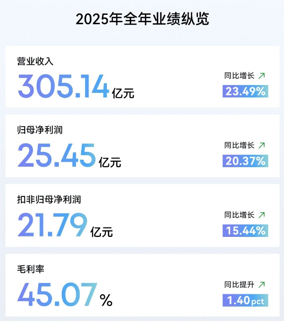 报告显示,2025年,公司全年实现营业收入305.14亿元,同比增长23.49%;实现归属于上市公司股东的净利润25.45亿元,同比增长20.37%;扣非归母净利润为21.79亿元,同比增长15.44%;毛利率达45.07%,同比提升1.40%。