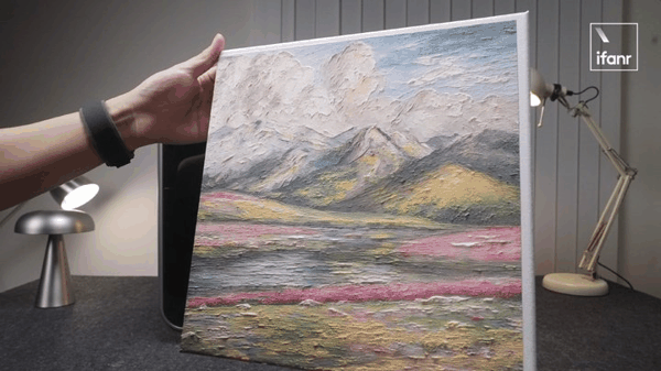 我们把一张自己拍摄的风光作品导入 E1 后,通过大模型生成了一幅带有 2 毫米高的浮雕纹理的油画,云层、水体、草地等等都是立体的。