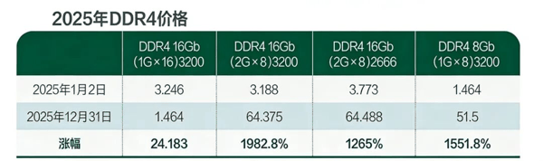 智研数据统计,DDR4颗粒半年涨幅超过300%,部分规格甚至从3美元涨到60多美元,涨幅接近20倍。