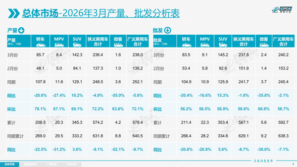 值得注意的是,受出口暴增的推动,3月我国乘用车批发同比增速较零售增速高出13.4个百分点,全国乘用车厂商批发销量达到237.8万辆(狭义乘用车),环比增长56.6%,同比下降1.6%。其中,自主车企批发销量约161.1万辆,同比增长2%,环比增长50%;主流合资车企批发销量约49万辆,同比下降10%,环比增长75%; 豪华 车企批发销量约27万辆,同比下降3%,环比增长69%。
