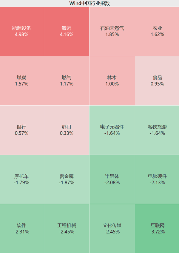 盘面上,上午 石油石化 、 航运 、农业、 煤炭 等板块走强,油气开采、 锂 矿、生物育种、猪产业等方向活跃; 计算机 、 传媒 、 电子 等板块走弱,AI算力、玻璃纤维等方向回调。