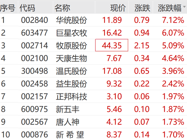 4月2日上午,A股 农林牧渔 板块盘中拉升,鸡产业、猪产业方向走强。 华统股份 涨超7%, 巨星农牧 、 牧原股份 、 温氏股份 等纷纷走强。
