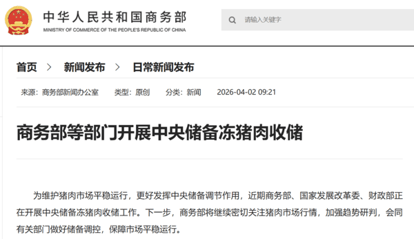 据商务部官网4月2日消息,为维护猪肉市场平稳运行,更好发挥中央储备调节作用,近期商务部、国家发展改革委、财政部正在开展中央储备冻猪肉收储工作。下一步,商务部将继续密切关注猪肉市场行情,加强趋势研判,会同有关部门做好储备调控,保障市场平稳运行。