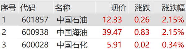 “三桶油”跟涨, 中国石油 、 中国海油 涨超2%。