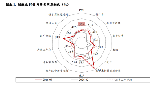 3月PMI显示国内经济在一季度末有明显修复,制造业供需两端同步改善,其中需求修复的斜率甚至快于生产端,是本月数据最大的积极信号,新订单指数23个月来首次高于生产指数。从结构上看,修复主要由高技术制造、装备制造、消费品以及有色等中上游行业带动,背后既有出口韧性支撑,也有“两新”政策延续、基建和地产投资边际修复的推动。与此同时,价格指标大幅上行,中东局势正在通过油价上升传导至化工品和其他中游产品,迫使出厂价格跟随式上涨。库存端则显示企业行为仍偏谨慎,采购有所恢复,但原材料库存和产成品库存修复幅度有限。