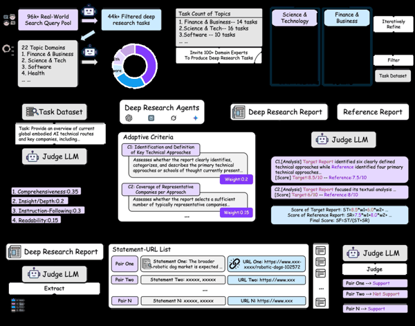 第一代的答案是 "让评估更智能"—— 通过动态权重、自适应标准和参考对比,使 LLM 评审能够灵活地判断报告质量,并取得了超越人类互评一致率的结果。