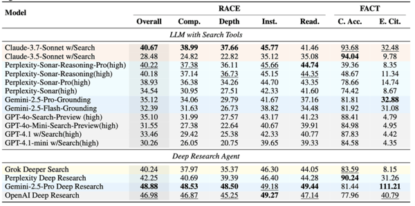 F A CT:检索到的信息靠不靠谱? 从报告中提取每一条事实声明及其引用的 URL,抓取对应网页内容后,逐条验证引用是否真正支持该声明。由此量化两个关键指标:智能体引用了多少 "有效信息"(E. Cit.),以及引用的准确率有多高(C. Acc.)。