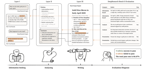 在评估维度上,V2 从信息组织的视角出发,将深度研究任务拆解为三层递进的核心能力: