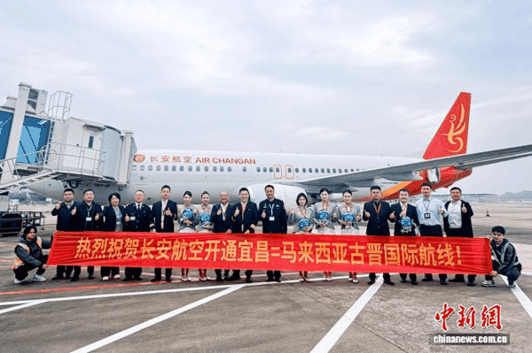 中新网 宜昌4月10日电 (张娜 钟高胜 董晓斌)随着长安航空9H8477航班于10日16时56分从湖北宜昌三峡国际机场起飞前往马来西亚古晋,宜昌⇌马来西亚古晋国际客运航线正式开通。