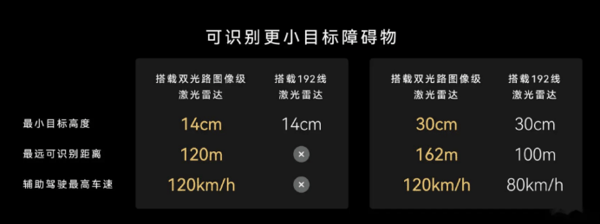 此外还有一些关键数据的提升:与之前 192 线激光雷达相比,新的激光雷达可识别最小目标高度从 30 厘米降至 14 厘米,并且可以在 120 米稳定识别;对于 30 厘米高的障碍物,最远可识别距离从 100 米升至 162 米;黑夜无光环境低反射率目标,比如黑色轮胎,最远识别距离从 42 米提升至 122 米。这三个数据对应的正好是当下激光雷达感知的三个痛点:高于底盘的小目标障碍物、低反射率障碍物和异型障碍物。与此同时,新的激光雷达雷达视窗硬度增加 25% ,更能应对高速撞击。
