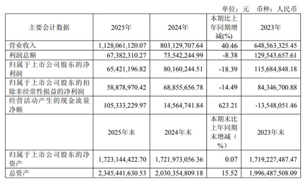 公司经营质量显著提升,经营活动产生的现金流量净额1.05 亿元,同比大幅增长 623.21%。截至 2025 年末,公司总资产23.45 亿元,归属于上市公司股东的净资产17.23 亿元,财务状况保持稳健。
