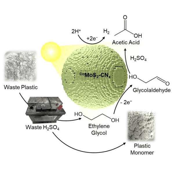 他们首先用汽车电池废酸对废塑料进行处理,将长聚合物链分解为乙二醇等化学构件,然后在阳光照射和光催化剂作用下,再将这些成分进一步转化为氢气和乙酸。