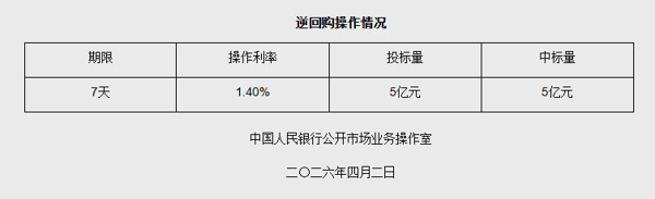 中新网 4月2日电 据央行网站消息,2026年4月2日中国人民银行以固定利率、数量招标方式开展了5亿元7天期逆回购操作,全额满足了一级交易商需求。具体情况如下: