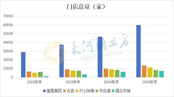 从门店规模来看,2025年末,蜜雪集团门店数量近6万家,其中,蜜雪冰城国内门店数量约4.4万家,规模遥遥领先;古茗、沪上阿姨均突破万家,分别达13554家和11449家。