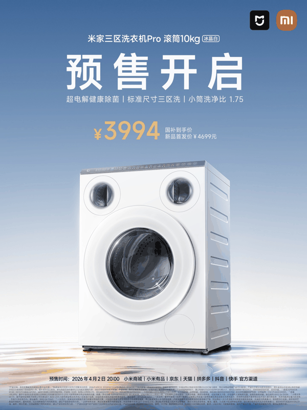 IT之家 4 月 3 日消息,昨晚,小米推出米家三区洗衣机 Pro 滚筒 10kg 冰晶白并开启预售,新品首发价 4699 元,国补价 3994 元,4 月 10 日 20 点开售。