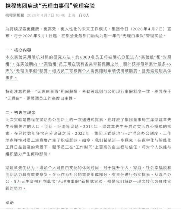 4月7日,据 携程 黑板报微信公众号消息, 携程 集团宣布将于2026年5月1日起,在部分业务部门启动为期一年的“无理由事假”管理实验。