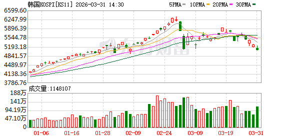 今日午后,韩国股市再度跳水,跌幅超过4%。截至收盘,韩国KOSPI指数下跌4.26%,报5052.46点,3月累计下跌19.1%,创下自2008年10月以来最大月度跌幅。个股方面,SK海力士跌超7%,三星 电子 跌超5%。自2月份高点以来,韩国KOSPI指数已回落20%。