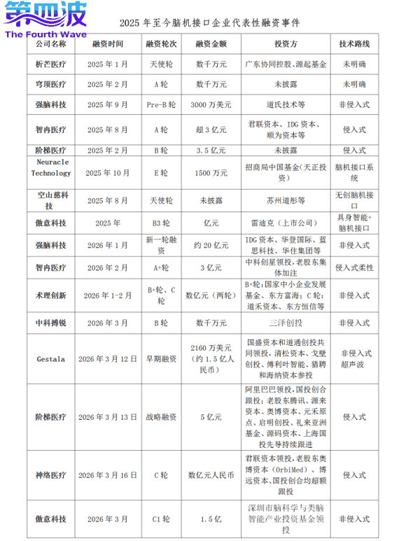 其中,强脑科技开年即获约20亿元融资,是迄今中国脑机接口史上最大单笔融资;中国首家超声波脑机接口企业格式塔科技完成1.5亿元天使轮融资,刷新该领域天使轮融资最高纪录;阶梯医疗获得5亿战略融资, 阿里巴巴 领投,腾讯等跟投,标志互联网巨头深度布局脑机接口。
