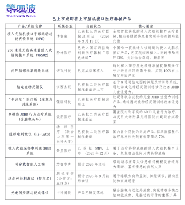 同时,侵入式脑机接口临床应用进入“准商业化”阶段,临床试验的突破有望快速落地。以脑虎科技、博睿康、阶梯医疗为代表的企业,在临床试验中已经积累了丰富的案例。部分半侵入式和柔性侵入式产品已进入国家药监局的“ 创新医疗 器械”绿色通道,预计2026-2027年将正式获批上市。这意味着侵入式脑机接口即将从“科研样品”转变为可收费的“ 医疗器械 ”,商业闭环即将打通。