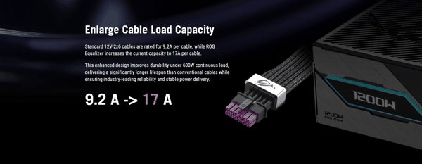 ROG Equalizer 线缆核心优势在于大幅提升电流承载上限。 标准 12V-2x6 线缆单线电流通常为 9.2A,而华硕将其提升至 17A。