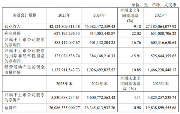 2026 年 3 月 31 日,上海龙旗科技股份有限公司(股票代码:603341,简称 “龙旗科技”)发布 2025 年年度报告。报告显示,公司全年实现营业收入 421.25 亿元,同比下降 9.18%;归属于上市公司股东的净利润 5.85 亿元,同比增长 16.76%;归属于上市公司股东的扣除非经常性损益的净利润 3.23 亿元,同比下降 15.91%;基本每股收益 1.27 元 / 股,同比增长 15.45%。公司拟向全体股东每 10 股派发现金红利 5.00 元(含税),合计拟派发现金红利 2.61 亿元(含税),该预案尚需提交 2025 年年度股东会审议。