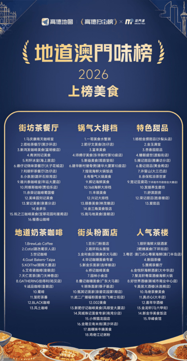 数据显示,2025年澳门接待旅客突破4000万人次,创历史新高。为帮助游客更好地“寻味澳门”,高德扫街榜上线“地道澳门味”系列榜单,涵盖人气茶楼、特色甜品、锅气大排档、街头粉面、地道奶茶咖啡及街坊茶餐厅等六大类别共90个商家,全方位呈现澳门多元美食特色。