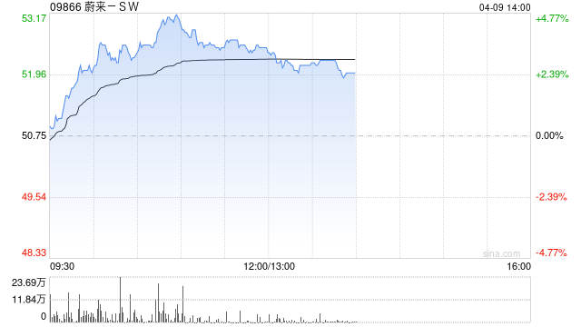 蔚来-SW (09866)盘中涨超4%,截至发稿,股价上涨2.86%,报52.20港元,成交额2.68亿港元。