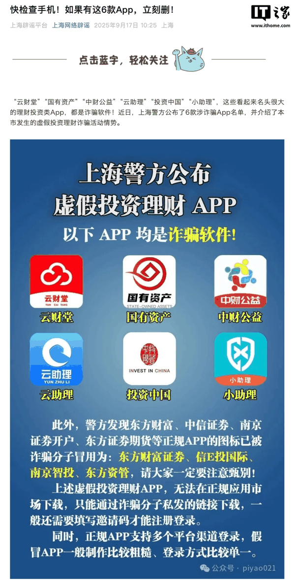 IT之家注意到,上海警方 2025 年 9 月公布的 6 款虚假投资理财 App 中,“投资中国”位列其中。警方提醒,虚假投资理财是发案最多、损失最大的电诈类型,中老年人尤其要当心。
