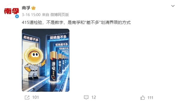 速读:近日,南孚电池官方微博分享了一则关于品质把控的内容,直言415道检验不是简单的数字,而是品牌和“差不多”划清界限的方式,这番朴实的表述,道出了南孚多年来坚守产品品质的核心准则,也让大众看到,南孚对品质的追求,从来没有半点敷衍。