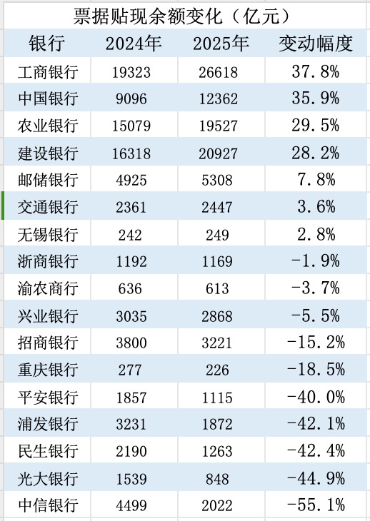 据界面新闻记者统计,2025年工农中建四大行票据贴现余额增幅在30%左右,远高于信贷增速。为完成今年信贷增长计划,大行票据贴现余额或进一步增长。