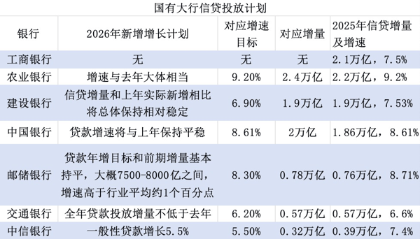 据界面新闻记者梳理,近期多家国有大行在业绩发布会上披露了今年的信贷投放计划。如 农业银行 (601288.SH)行长王志恒在该行业绩会上表示,将保持信贷支持实体经济的力度,预计全年的信贷增速与去年大体相当。