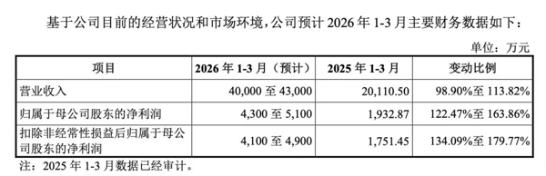 联讯仪器 招股书称,预计公司2026年一季度实现净利润4300万元至5100万元,同比增长122.47%至163.86%。