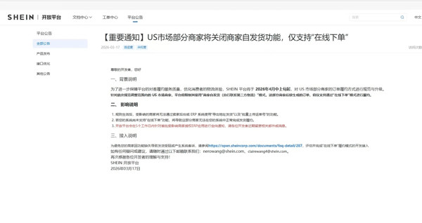 加强物流管控!SHEIN将于4月中上旬限制美区商家自发货功能