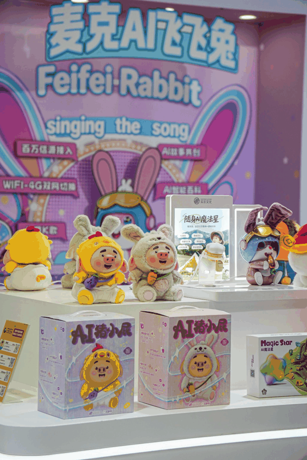 除上述两款首发新品外,实丰文化全系列AI玩具矩阵也同步亮相本次展会,展现了其在产品布局上的全面性与前瞻性。产品布局全面覆盖不同年龄段、不同消费需求的群体,形成了完善的产品体系。参展产品不仅包括随身AI魔法星、AI飞飞兔、麦克AI飞飞兔等自主研发的IP产品,还涵盖了小度熊、乖巧宝宝、猪小屁等知名IP的AI玩具系列,充分体现了其在IP运营与产品研发方面的多元布局。所有参展产品均遵循“一IP一特色”的产品开发理念,在外观设计、功能设置等方面贴合对应IP的核心特质,展会现场,不少观众驻足其展位,近距离体验各类产品的交互功能,现场互动氛围热烈。