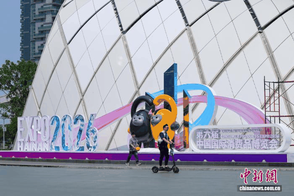 图为第六届中国国际消费品博览会主会场入口处的户外主题景观。 中新社 记者 骆云飞 摄