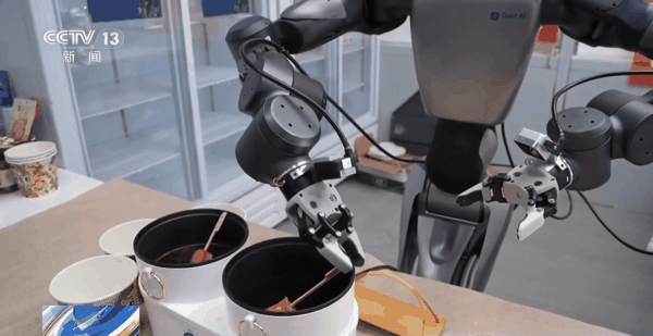 穿上机器人的模仿学习设备,控制这个机器人手部一模一样的夹爪,我们就可以完成整套涮火锅的人类示范教学。看起来简单的动作,但其实位置、角度、力度甚至弯腰屈膝的弧度都得精准拿捏。而训练有素的数采员,顺利完成了一系列涮火锅的采集动作。一条条反反复复模拟涮火锅过程的视频被录制出来,一共汇总了共计八个小时的有效数据。工程师将采集过来的真机数据投喂给机器人基座大模型后,机器人就初步具备了行为的执行能力,通过这些精准的数据训练,很快机器人就上手了。