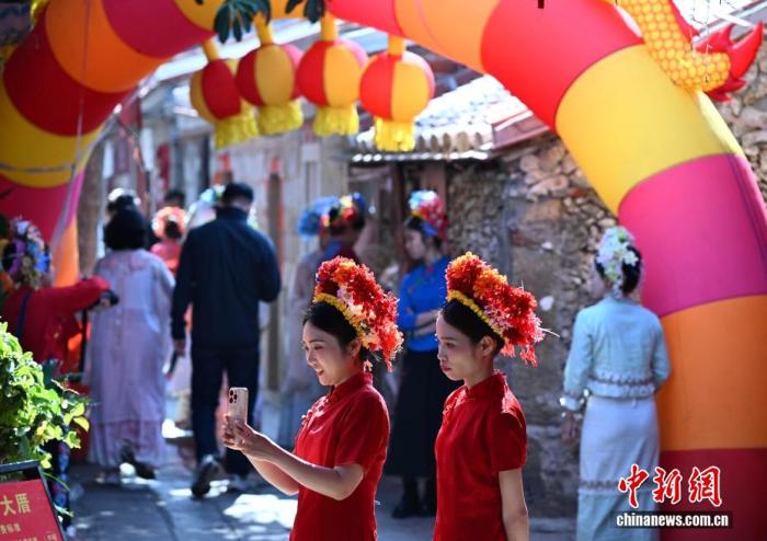 图为3月17日,蟳埔村街道巷陌,处处是头戴簪花的游客,人头攒动如同一座座“流动的花园”。 中新社 记者 张斌 摄