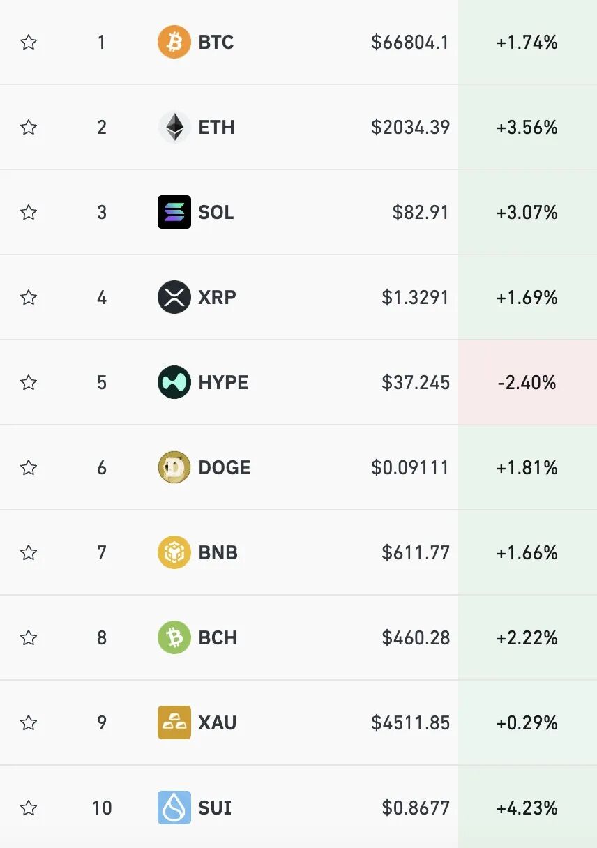 加密货币多数上涨,比特币报66804美元,日内涨1.74%,以太坊报2034美元,日内涨3.56%。