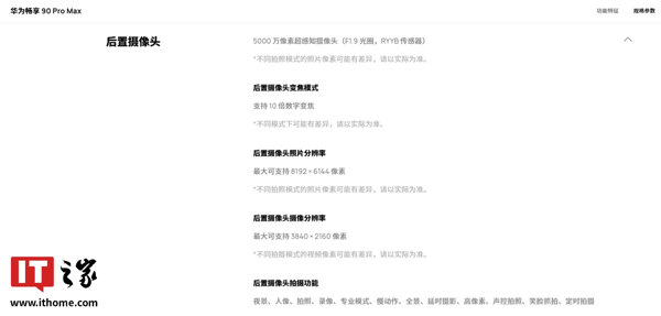 IT之家从华为官网获悉,华为畅享 90 Pro Max 手机后置 5000 万像素超感知摄像头(F1.9 光圈,RYYB 传感器),最大可支持 8192×6144 像素照片分辨率,并提供夜景、人像、拍照、录像、专业模式、慢动作、全景、延时摄影、高像素、声控拍照、笑脸抓拍、定时拍摄等功能。