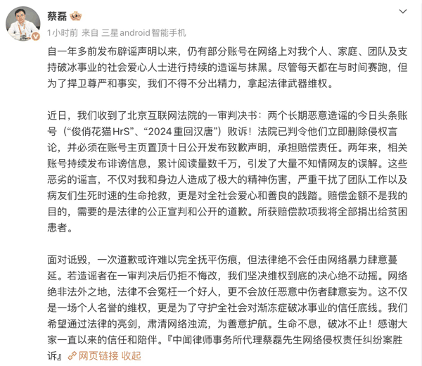 蔡磊随即在个人社交账号发文称,过去一年多来,针对自己及家庭、团队的网络造谣从未停止。“尽管每天都在与时间赛跑,但为了捍卫尊严和事实,不得不分出精力拿起法律武器。”他表示,赔偿金额不是目的,需要的是法律的公正宣判和公开的道歉。所获赔偿款项将全部捐出给贫困患者。