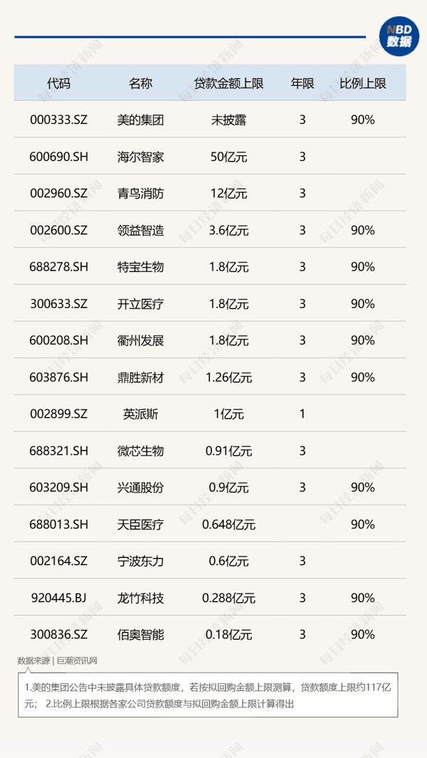 从资金来源看,截至4月2日,共有18家公司在公告中明确回购资金包含回购专项贷款,其中15家已披露贷款额度, 美的集团 和 海尔智家 的贷款额度遥遥领先。 美的集团 表示, 中国银行 将为公司提供不超过实际回购金额90%的贷款资金专项用于股票回购,贷款期限不超过3年。按本次回购上限130亿元计算,对应最高贷款额度可达117亿元,将成为回购再贷款设立以来单笔规模最大的一笔。 海尔智家 拟回购金额30亿元~60亿元,贷款额度也高达50亿元。