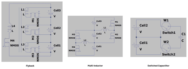 图 3. 三种最具代表性的主动均衡解决方案架构:反激式(左)、多电感(中)和开关电容(右)