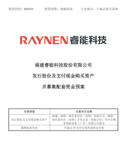 4月9日晚, 睿能科技 (603933)公告,公司拟发行股份及支付现金购买杨博、杨硕、鑫昂泰等9名股东持有的博泰智能装备(广东)有限公司(简称“博泰智能”)75%股权,同时计划向不超过35名特定投资者募集配套资金。公司股票4月10日开市起复牌。