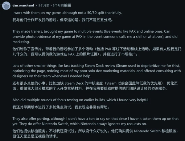 有合作过的开发者称,这家发行商拥有不错的线下资源整合能力,很擅长把旗下的游戏带到PAX这样的大型展会上露脸,还能帮忙推进平台审核进度,是一家宣发资源和能力都还不错的发行商。
