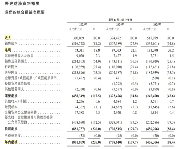 财务数据显示,2023年至2025年,XREAL的营收分别达3.90亿元、3.94亿元和5.16亿元,亏损分别为8.82亿元、7.09亿元、4.56亿元。公司产品销售以海外市场为主,2025年,其海外及中国内地收入占比分别为71%、29%。