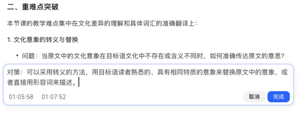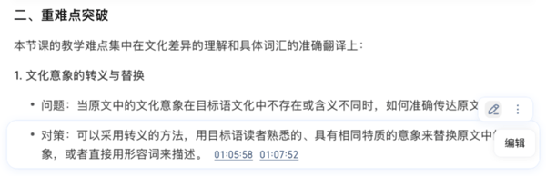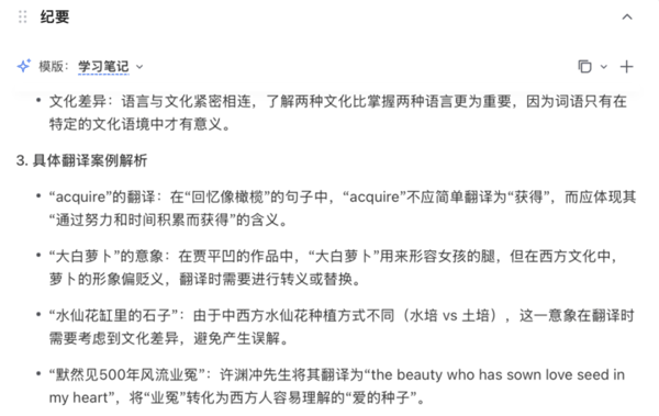 我在复盘时发现一个有趣的细节:老师在讲「Memory, like olives, is an acquired taste.」这句话如何翻译时,用了相当长的篇幅分析「acquired」,AI 纪要把这段内容压缩成了要点,而不是一堆原话的堆砌。