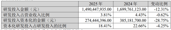 数据显示,2025年江铃汽车的研发投入金额同比减少12.31%,为14.9亿元,其中资本化研发投入更是减少28.75%。这一数据与公司年报中大篇幅强调的“智能网联、 新能源 、轻量化”等技术储备形成了鲜明的反差。