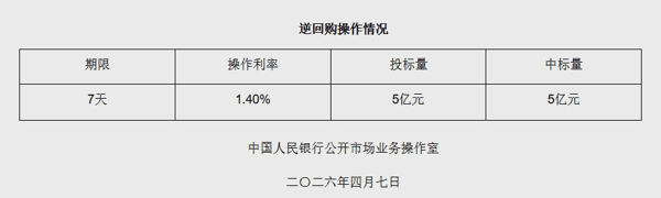 中新网 4月7日电 据央行网站消息,2026年4月7日中国人民银行以固定利率、数量招标方式开展了5亿元7天期逆回购操作,全额满足了一级交易商需求。具体情况如下: