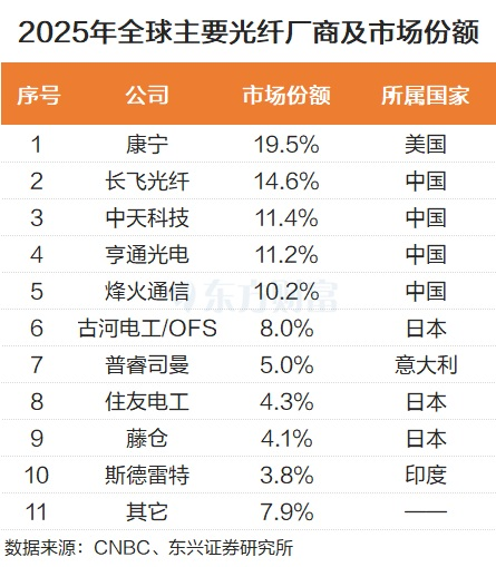 根据CNBC统计数据,2025年, 长飞光纤 占据全球光纤市场的比例为14.6%,排名全球第二,仅次于美国的 康宁 公司,该公司2025年在全球光纤市场中的份额为19.5%。我国的 中天科技 、 亨通光电 、 烽火通信 位列全球的第三、四、五的位置,市场份额分别为11.4%、11.2%和10.2%。