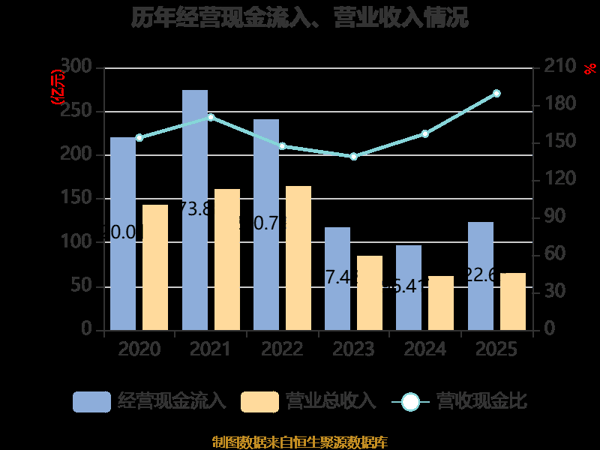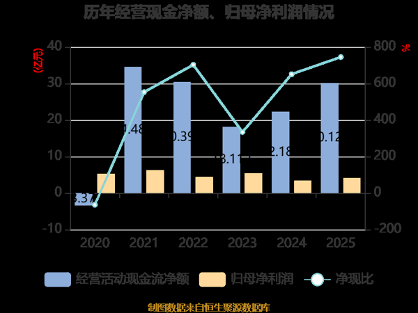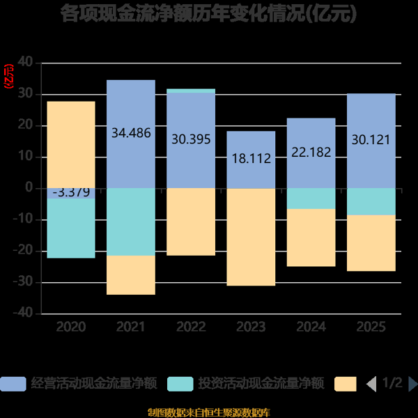 截至2025年,公司经营活动现金流净额为30.12亿元,同比增长35.79%;筹资活动现金流净额-17.88亿元,同比增加4322.88万元;投资活动现金流净额-8.6亿元,上年同期为-6.64亿元。